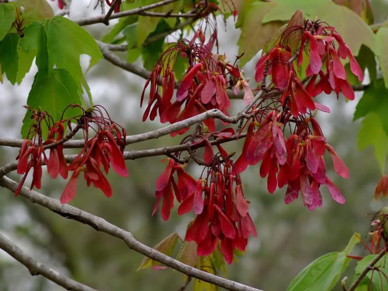 Fleurs | printemps, minuscules fleurs rouges en grappes dressées suivies de samares ailées |