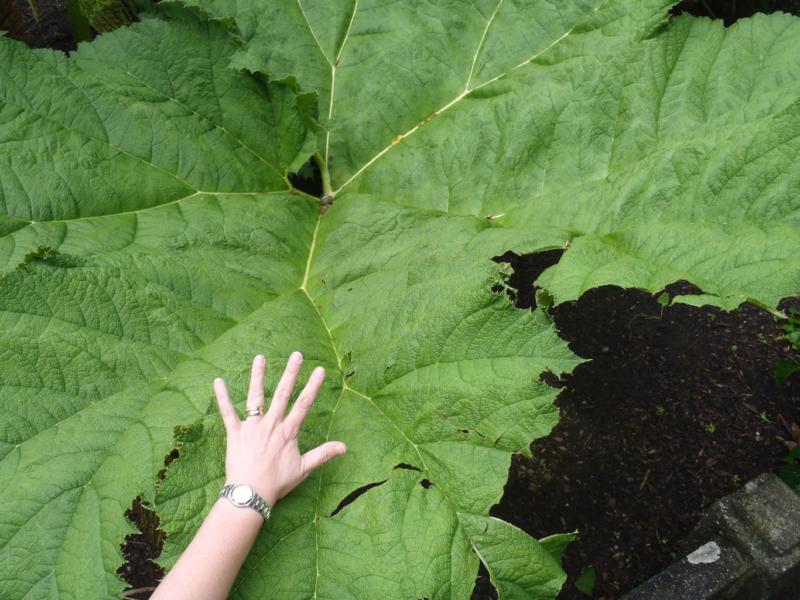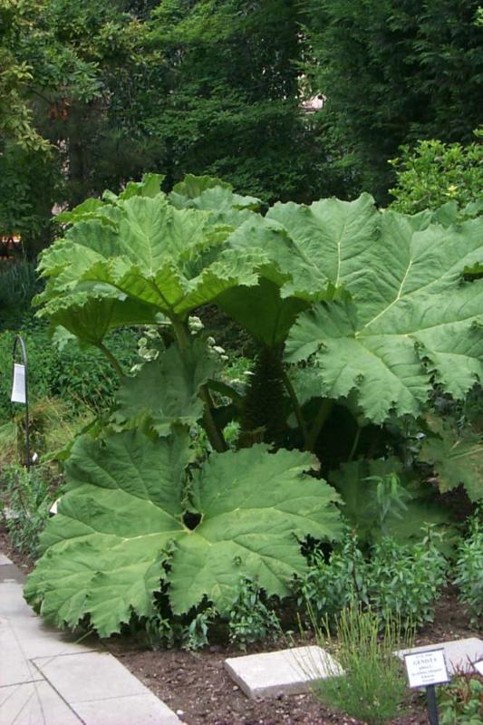 | Feuilles | énormes feuilles dont le limbe peut atteindre 2m de diamètre, et qui forment une couronne de plusieurs mètres d''envergure au niveau du sol. Ces feuilles magnifiques sont à bord crénelé, et leur surface est parcourue de sillons marqués au niveau des nervures. |