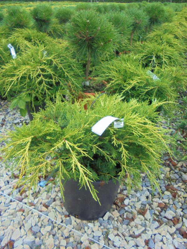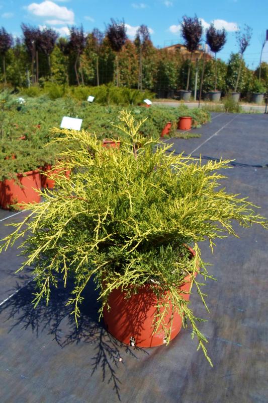 le plus répandu et le plus apprécié des Juniperus est un conifère largement étalé (jusqu’à 3m de diamètre) à la végétation dense et compacte. Il forme un épais tapis joliment touffu. Son feuillage est d’un magnifique jaune d’or qui reste assez soutenu tout au long de l’année. Lumineux et décoratif, il s’utilise en massif, isolé, rocaille et se montre idéal en tant que couvre-sol.
