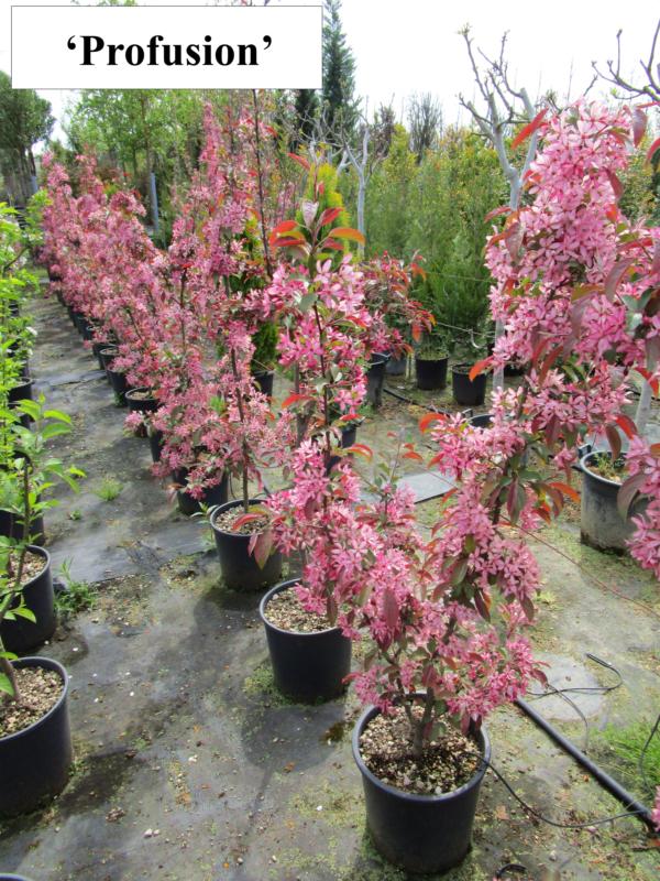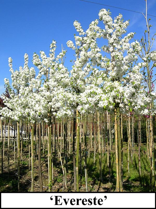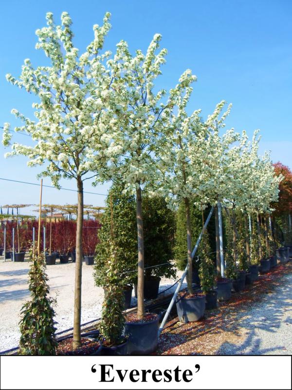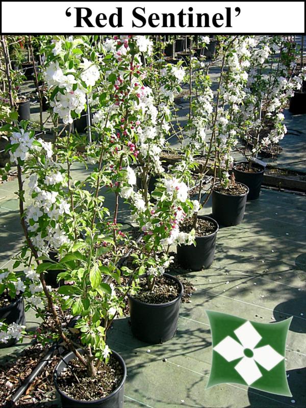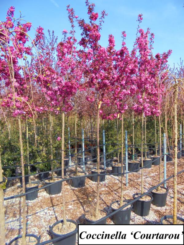 | Variétés disponibles | Coccinella 'Courtarou': Origine: France. Arbuste ou petit arbre à vegetation érigée, s'élargissant avec l'age. Feuilles caduques rouge cuivré au printemps, vert cuivré en été. Grandes fleurs simples rouge magenta, puis rose clair. Petit fruits rouge vif, durables.'Evereste': Port dressé, plus étalé en vieillisant, feuilles caduques, ovales, alternes, simples, dentées. Vertes devenant jaune orangé en automne. Fleurs: début du printemps. Boutons rose soutenu suivis de fleurs blanches réunies en corymbes. Fruits très abodants, très durables, de rouge orangé à rouge garance.'Red Sentinel': Origine : Nouvelle Zélande 1959. Hauteur : 5/6m- largeur : 3/4m. Port étalé et retombant. Craignant la sécheresse, s'enracinant profondément dans un sol frais, les feuilles sont de couleur bronze. Boutons floraux rose vif virant en une floraison blanche simple. Nombreux petits fruits rouge très décoratifs jusqu'à la fin de l'hiver aussi utilisés en décoration florale.'Profusion': Arbre de petite taille cultivé pour sa riche floraison printanière et sa fructification généreuse et colorée à l'automne. Port étalé. Feuilles simples, elliptiques, mesurant jusqu'à 8 cm de long, et de couleur rouge pourpré puis vert bronze. Abondance de fleurs simples, roses pourpré foncé. Fruits sphériques, d'environ 1 cm de diamètre, de couleur pourpre, ressemblants à des cerises. |