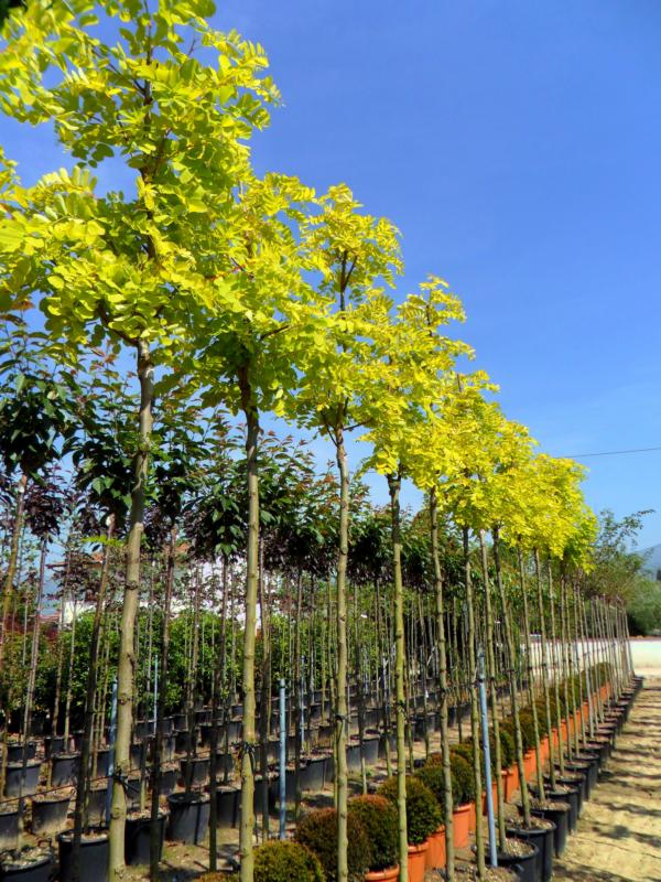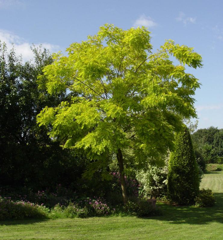 | Feuilles | caduques. Son attrait principal réside dans le couleur de son feuillage, d'un beau jaune clair, doux, qui verdit à peine. Il s'achève dans des tons jaune orangé, en automne, et permet des jolies combinaisons de couleur |