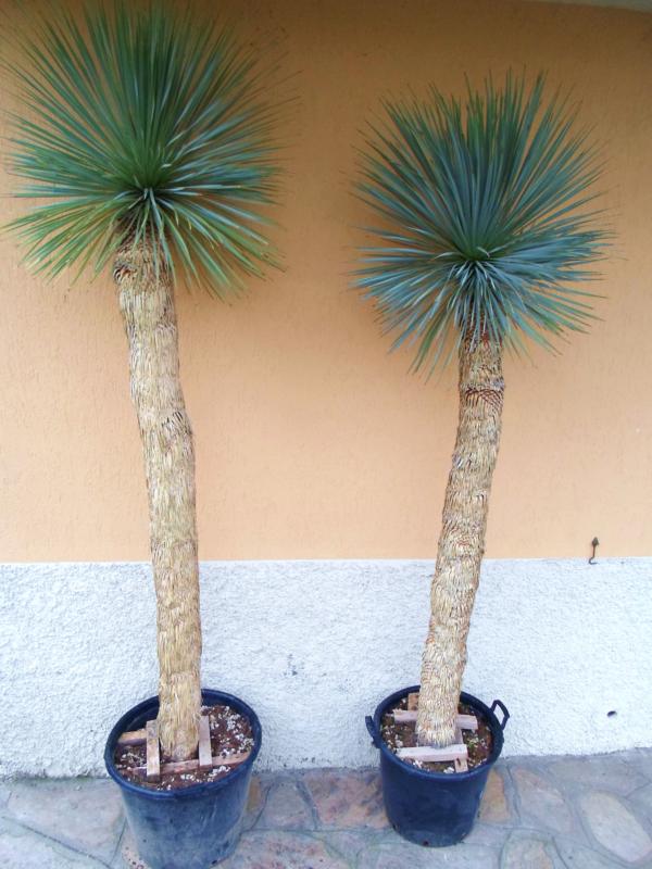 | Feuilles | les feuilles, persistantes, nombreuses, fines et bleues, sont réunies en couronne régulière au sommet du tronc. A leur mort, elles s'affaissent le long du tronc et forment un jupon protecteur |